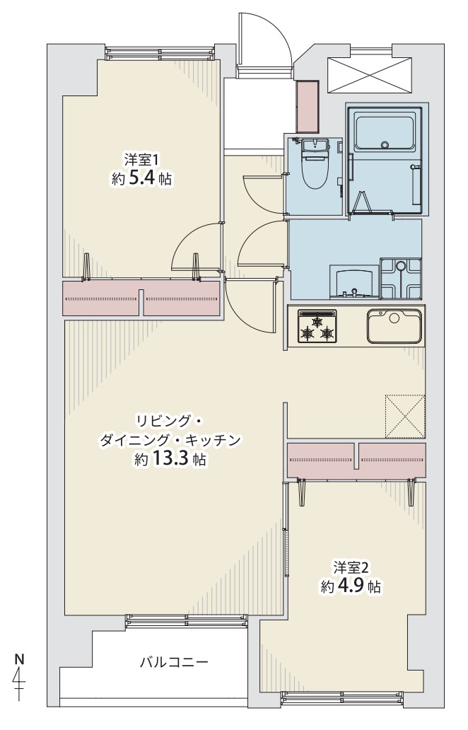 間取りはコンパクト感がちょうどいい2LDK。単身やDINKS、セカンドハウス向けのお部屋です!54㎡の広さでも廊下がコンパクトな分、個室の広さを確保できているので使いやすい!独立キッチンも吊戸棚と食洗機付きで機能的!家事も捗ります!!