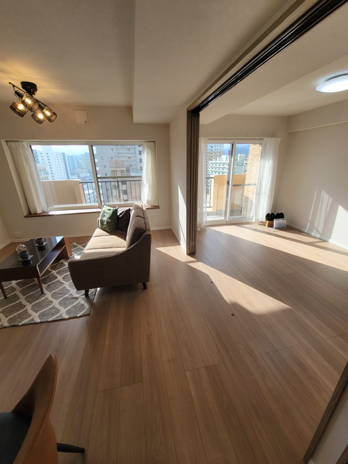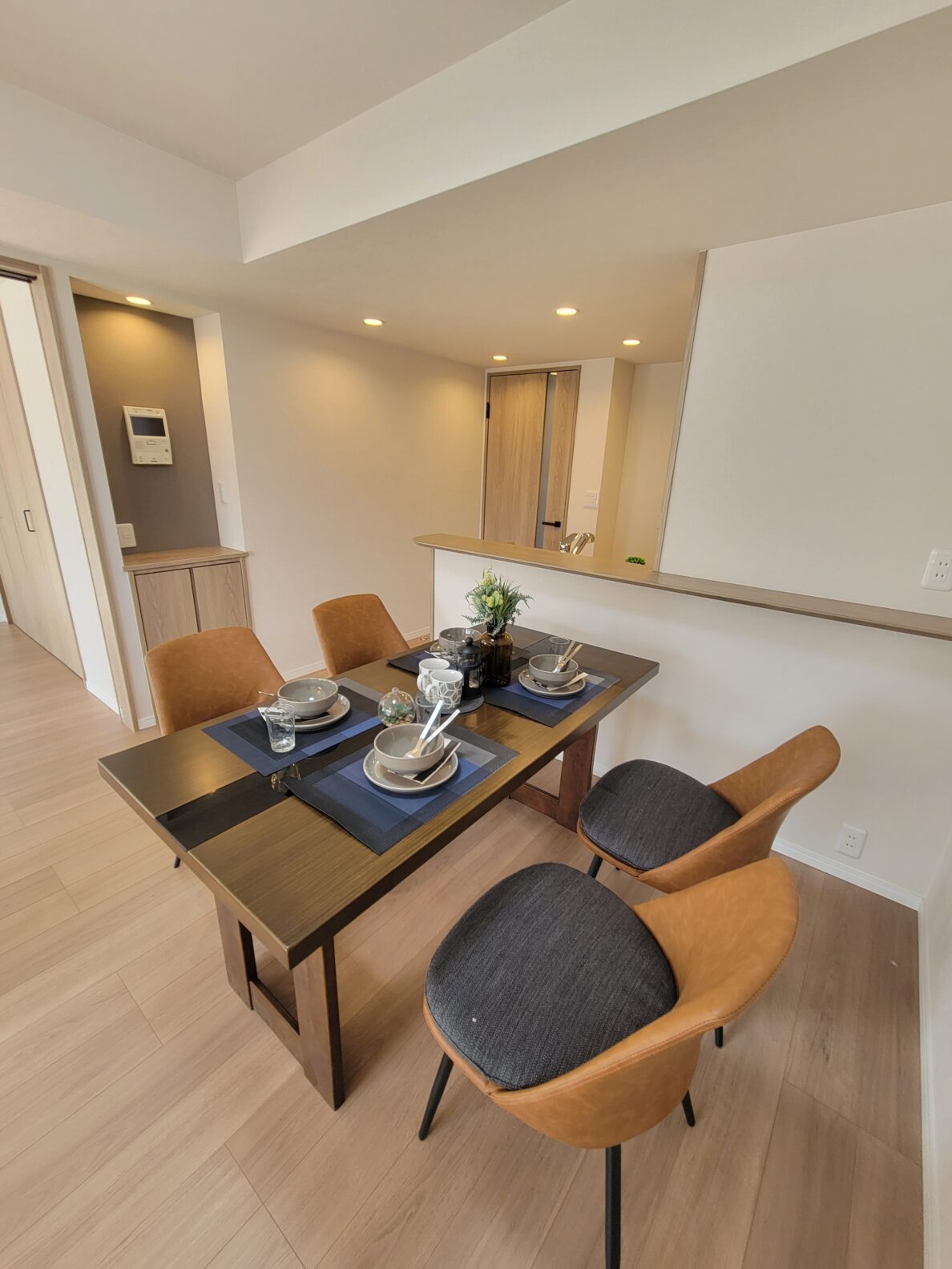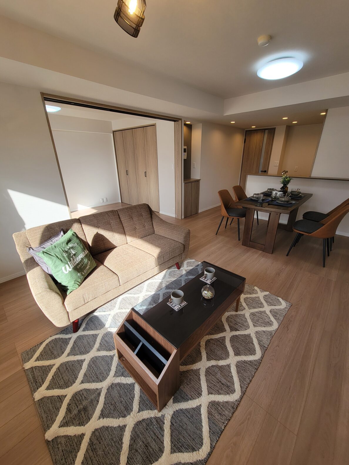 上層階の爽快な眺望とあたたかな陽射しを受けるリビングが特徴の3LDKは、幅広いニーズに応えられるお部屋。開放感のあるオープンキッチンとダイニングセット、窓辺にはソファーを置いてくつろぎの空間を演出できます。それぞれの洋室もしっかりと広さがあり、ファミリークローゼットなど大型収納もあるのでファミリーでも使いやすい!