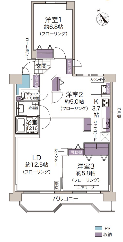 爽快な眺望が広がる南向きのリビングがぽかぽかで気持ちのいい3LDKは、それぞれの洋室や廊下、キッチン奥にも窓がついているので、どこにいても明るさが感じられる間取り!玄関の姿見鏡や、キッチンの吊戸棚とカップボードなど、あるとうれしい設備もポイントです!!